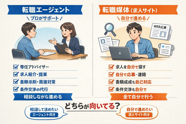 転職サービスには大きく分けて、転職エージェント と 転職媒体(求人サイト) の2つがあります。